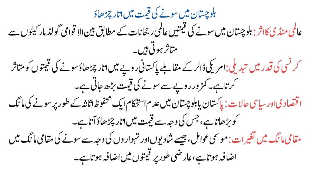 - Global gold prices significantly impact local prices in Balochistan, as gold is traded in U.S. dollars.
